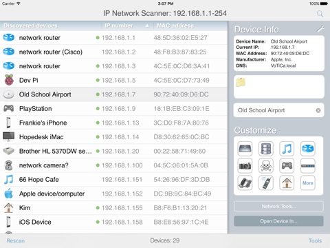 Ça ne détecte rien sur mon réseau a part liPhone lui même ... Ah si une fois ma freebox est apparue au bout de 45 secondes ( so fast ! ) Pourtant jai bien au moins 4 autres périphériques qui répondent au ping .....