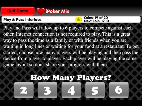Dont have the time for a friendly poker party at your house? iPoker Mix is a game that can be played with friends over the internet or play 2 different single versions of the game, at your own pace. No timers - just a peaceful poker game.