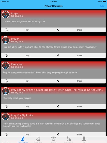 The Me tab allows you to change your profile picture (by clicking the current picture), see how many requests you have made, view your stats, or even view all your past requests, and see how many people are praying for each one.