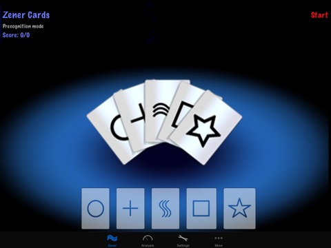 iPrecognition is an e-game with a complete ZENER card game. The 25 ZENER cards are divided in five groups of five cards. Each group has a different symbol as : circle, square, cross, waves and star.