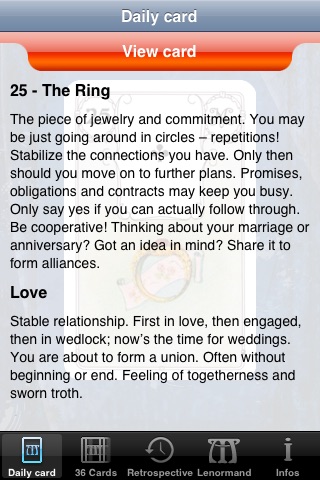 You select your daily card once a day in the "Daily card" menu. Before you make your choice focus your thoughts on your question of the day! Then you can read the corresponding text (daily tendency 24-48 hours). You will also find additional information on the subjects of "Love, career and health."