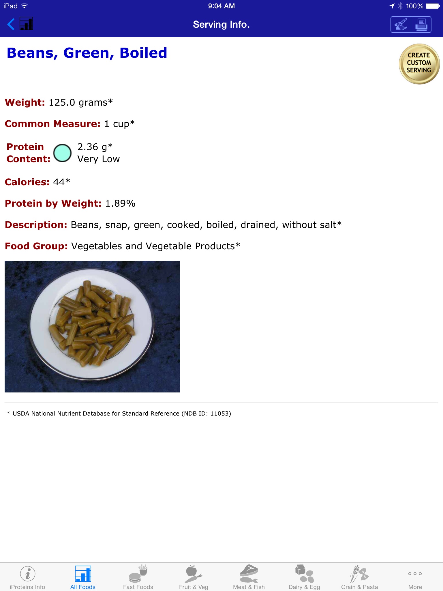 The information is derived from the USDA National Nutrient Database for Standard Reference: Protein Content of Selected Foods per Common Measure. iProtein currently features over 1,100 different food servings and can also be searched according to how a food is prepared. (i.e. "canned spinach" versus "frozen spinach" or "granola with raisins") ...