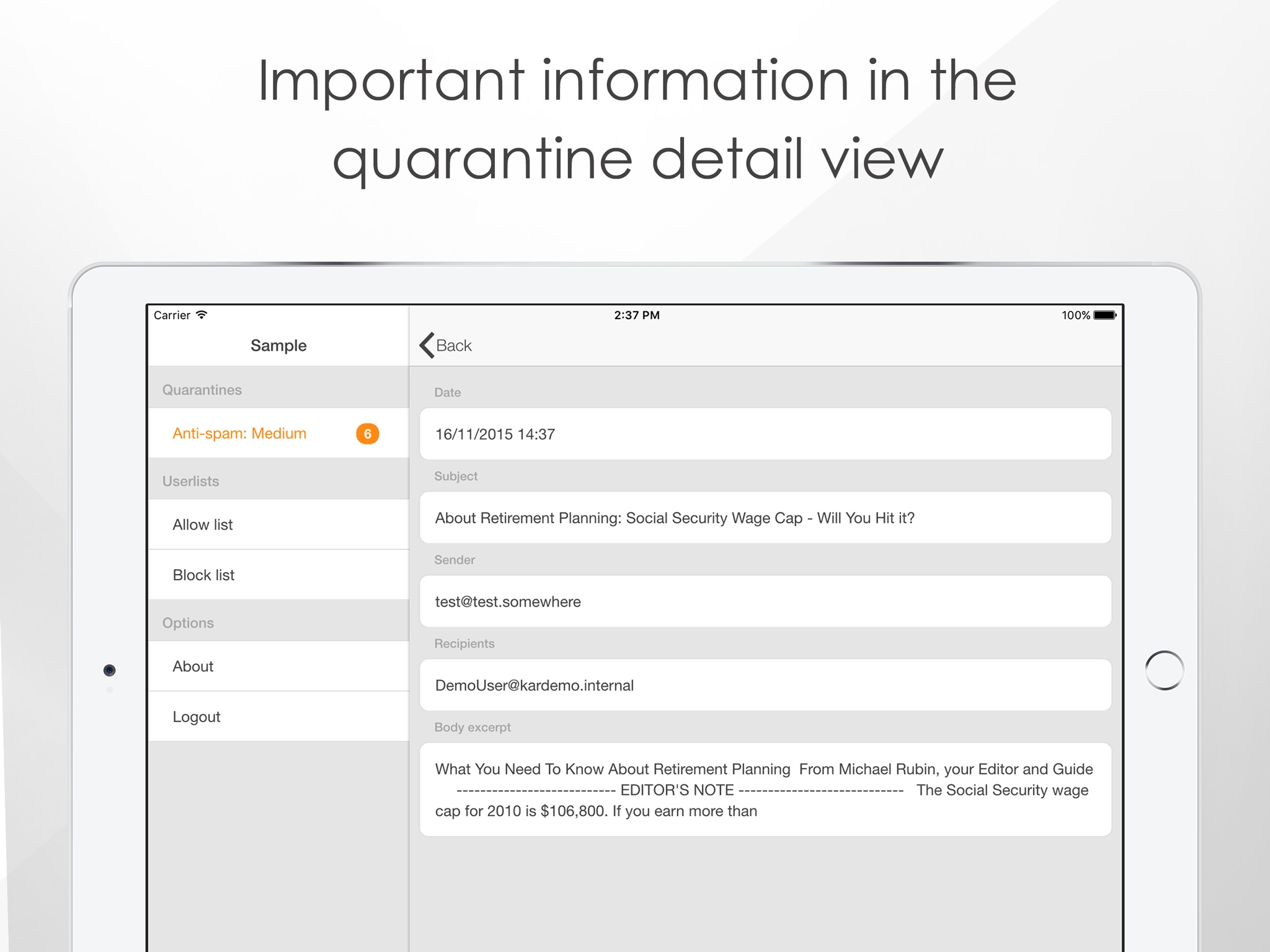 The app iQ.Suite Quarantine is part of the iQ.Suite email management solution developed by GBS. The app provides all the benefits of the iQ.Suite modules Wall and Watchdog, GBS solutions for secure spam and virus protection. The app provides mobile access to the quarantine, one of the key iQ.Suite functions. With the app, its easy to manage potential spam or other blocked emails, including: