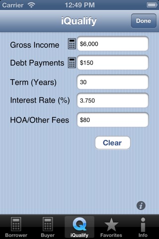 iPhone 5S & iOS 7 compatible. Based on your income and loan info, iQualify will provide you with a conservative and aggressive estimate of how much you could qualified for a loan. An easy to use mortgage calculator for buyers, borrowers, realtors, or loan professionals. Calculates payment, payment schedule, monthly housing expenses, total housing expenses, total interest, and total payment. Features include bookmarking, email, and more.