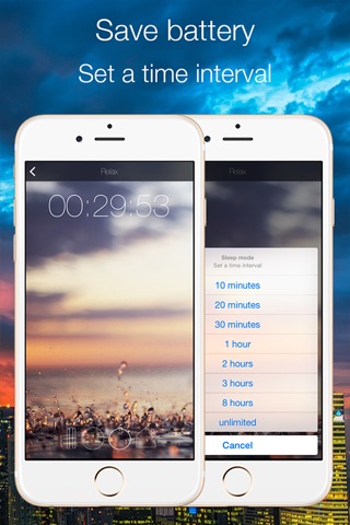 Additionally, this app includes a power saving mode that works as follows: The user selects a time interval, when finished, the app stops working. Very useful if we want to go to sleep listening to, for example, the sound of rain hitting a window, so you will not have to worry about stop the sound, iRain will do it automatically.