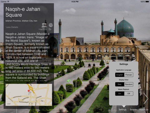 Iran has one of the oldest civilizations and biggest empires throughout the history, and probably is the first nation state in the world. Despite its historical importance the tourist industry in Iran has not received the attention it deserves. As such, some of the national heritage might have been claimed by other countries as their own. On the other hand many of the Persian heritage are scattered around the world, being displayed in museums or have been lost. This reflection gave us the motivation to collect all the multidimensional vast Persian heritage (i.e., cultural, scientific, natural) in one place as a mean to protect their identity; this application introduces Iran world heritage in Persian and English for domestic and foreign visitors. We started with over a hundred places, including all the UNESCO registered sites, for the first version. Our goal is to develop the most comprehensive tourist guide application of Persia, to include those national heritage outside the country borders such as the music, castles, fire temples, and Persian gardens, as well. Your support is our motivation.