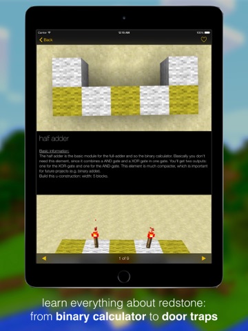 This app does also contain a full library with all minecraft redstone items and shows how to craft them.