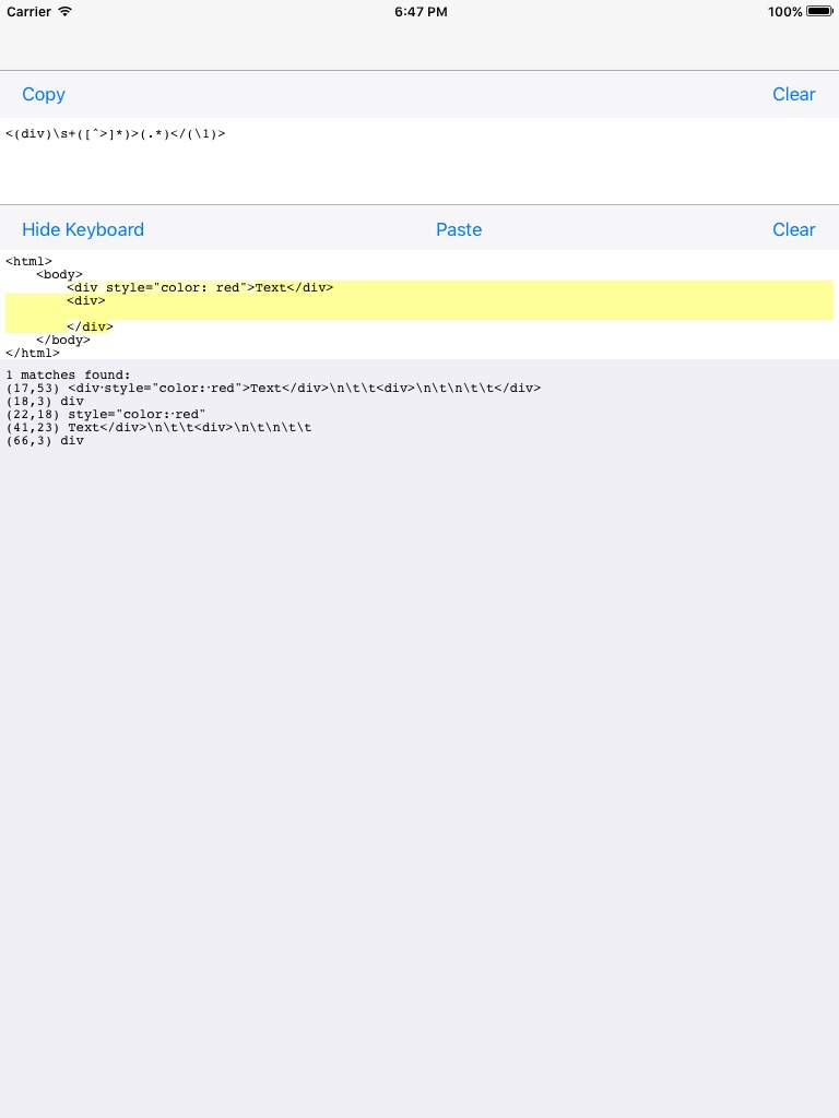 Just a basic regular expression tester. Shows capture groups and highlights matches. Many more features to come in future updates including bookmarked expressions, bookmarked search text, in-app documentation, shortcut keys, special matching options, and opening external files. Developed this simple app because there were no free apps supporting realtime match updates in the app store. Please write to me if you would like this to have more features, or are interested in working on this as an open-source project.