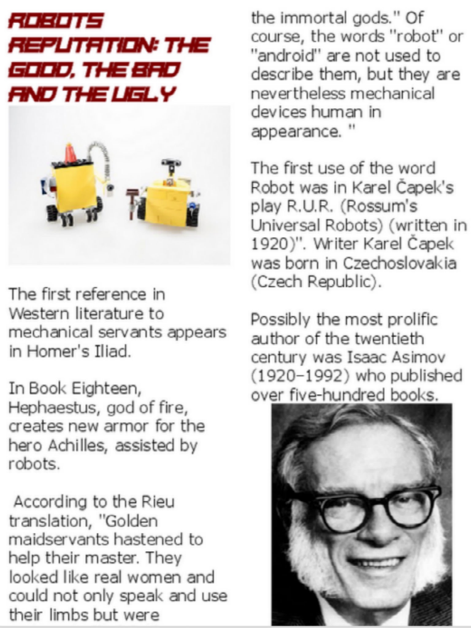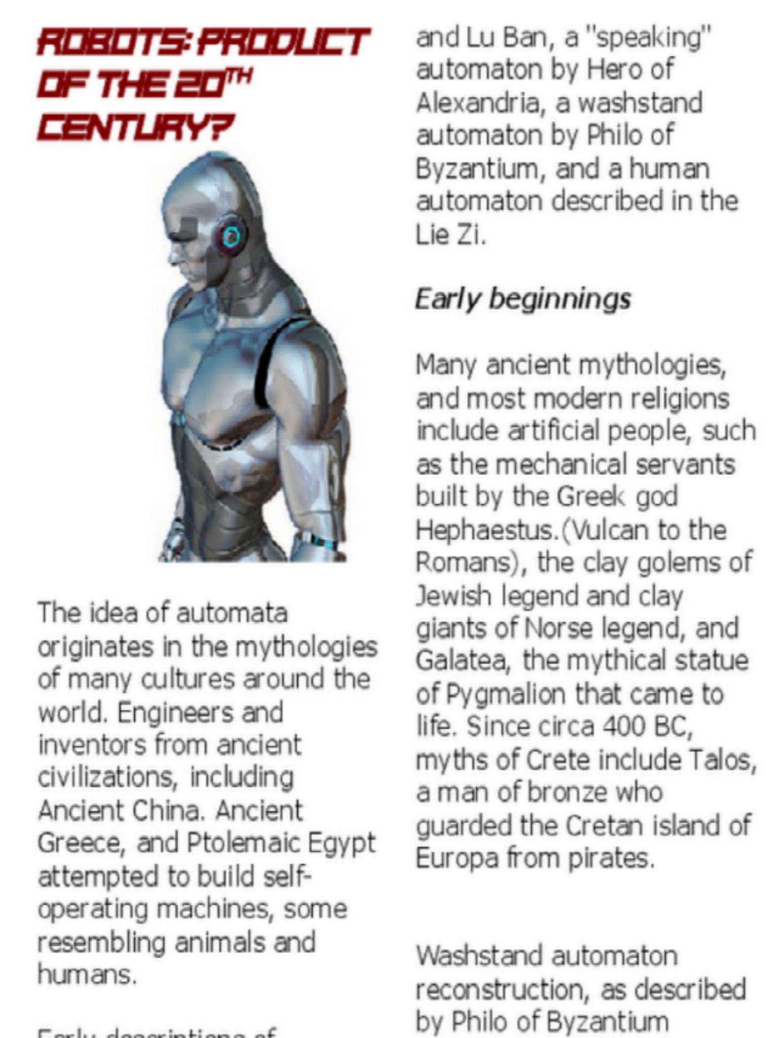 Robots have been with us for less than 50 years, but the idea of inanimate creations to do our bidding is much, much older. The ancient Greek poet Homer described maidens of gold, metallic helpers for the Hephaistos, the Greek god of the forge. The golems of medieval Jewish legend were robot-like servants made of clay, brought to life by a spoken charm. Leonardo da Vinci drew plans for a mechanical man in 1495.