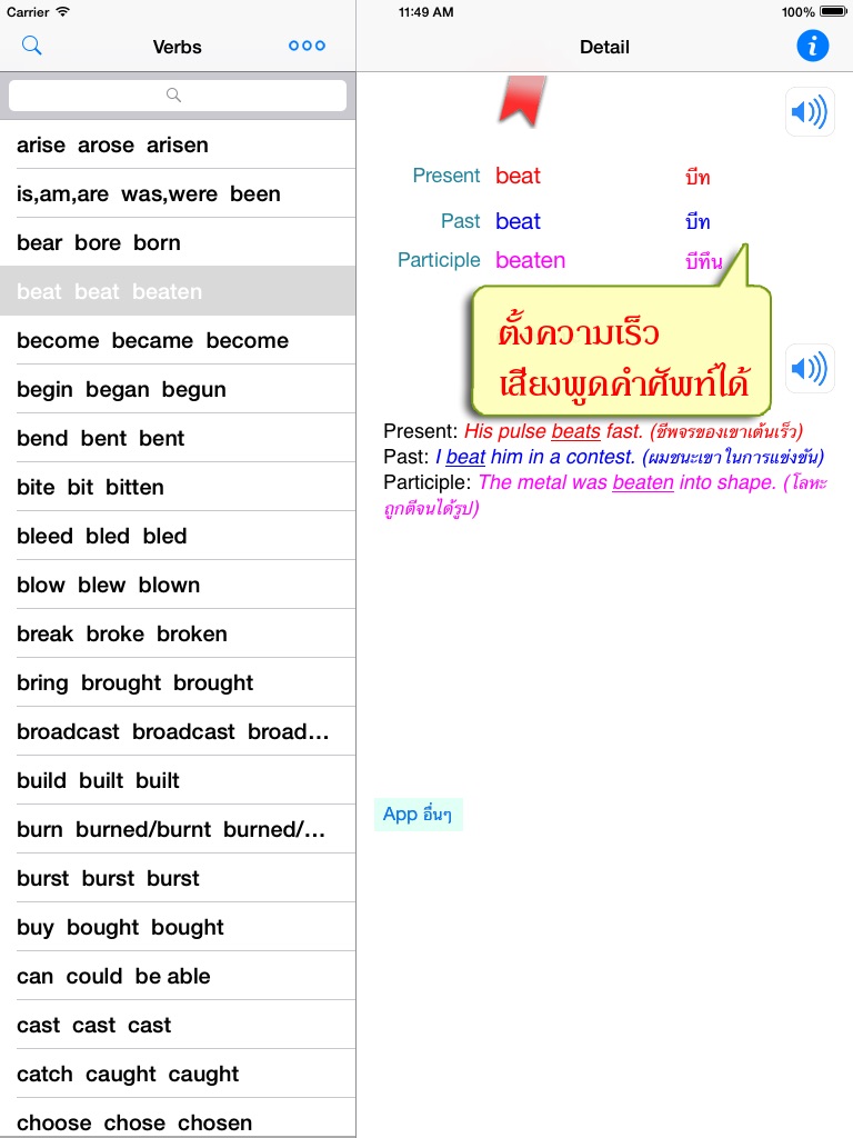 - ออกเสียงพูด คำศัพท์ และ เสียงพูดตัวอย่างประโยค (พูดได้ถึงแม้ใช้ในโหมด Offline )