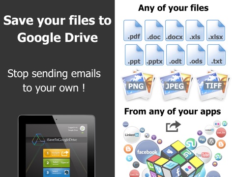 We know what you need. And here is no useless features, complex user interface. Open with iSaveToGoogleDrive and there you go. It just works!