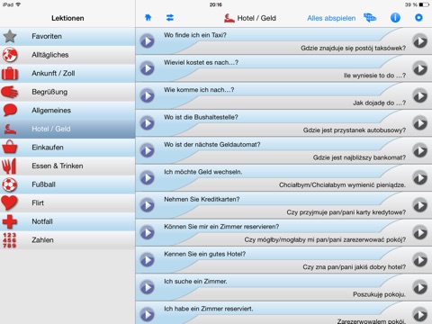 Polnisch gefällt mir super! Dieses App ist die perfekte Unterstützung für meine bisher mageren Kenntnisse. Für meine bevorstehende Reise nach Polen fühl ich mich nun bestens vorbereitet. Der Sprecher spricht sehr klar und deutlich, was ja gerade bei einer solch komplizierten Sprache wichtig ist! Die Bedienung von iSayHello ist selbsterklärend und das Design insgesamt ist sehr ansprechend! Von mir gibts 5 Sterne.