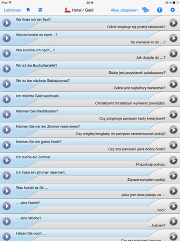 Schönes App, doch leider fehlt mir die Möglichkeit die einzelnen Phrasen zu kopieren und teilweise auch zu lesen da sie nur beim Apspielen komplett angezeigt werden. Ideal wäre es, wenn man sich sein eigenes Vokabelheft/Wörterbuch erstellen könnte um verschiedene Phrasen miteinander zu kombinieren. Auch wäre die Lautschrift nicht schlecht. Ansonstens ganz gut.