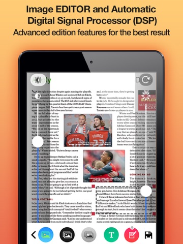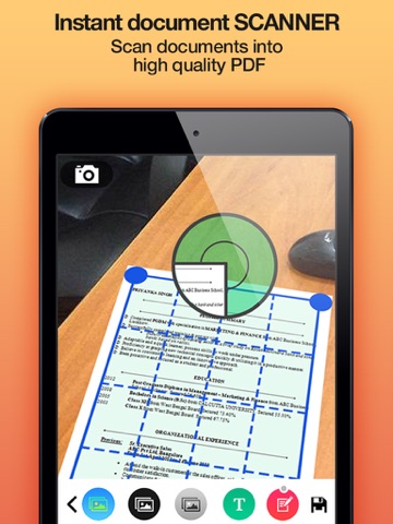 Save your multi-pages scanned documents as PDF, JPEG, PNG, TXT files, synchronize between devices using Dropbox, Evernote, as well as the «Open in» feature, by which the document can be imported into any other application that supports the above mentioned file formats (Word, Excel, Access, Power Point, Photoshop), send documents via E-mail, print them in one single tap, and much more!
