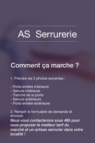 Le principe est simple: lapplication vous permet de prendre en photo la serrure sur laquelle vous souhaitez réaliser des travaux. Nos spécialistes analysent vos données, et reviennent vers vous sous 48H avec un devis au plus juste, et un serrurier de confiance connu de notre réseau dexpert.