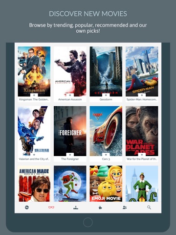 When you are in the mood for new movies, tap the add button to go to the Discovery area, where you can see our personal picks, trending and popular movies. If youre connected to Trakt.tv, you can also get recommendations based on your movies, as well as find out what movie your friends are watching.