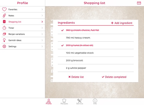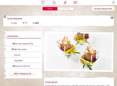 Our comprehensive recipe collection in the app version ranging from simply pleasurable dishes to creatively refined cuisine. Whether while shopping, in the kitchen, or far away from the stove, anywhere and anytime.