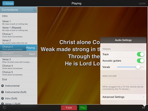 Download a song from the growing built in library and you can take out the vocal, repeat a chorus, end by going back to verse 1, break down into a quiet instrumental section to talk or pray over, or sing a chorus with just the drums playing. iSingWorship uses SATT™ (Smooth Audio Transition Technology) for incredibly smooth and natural song section changes.