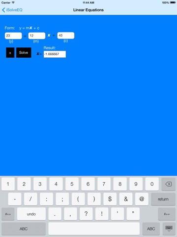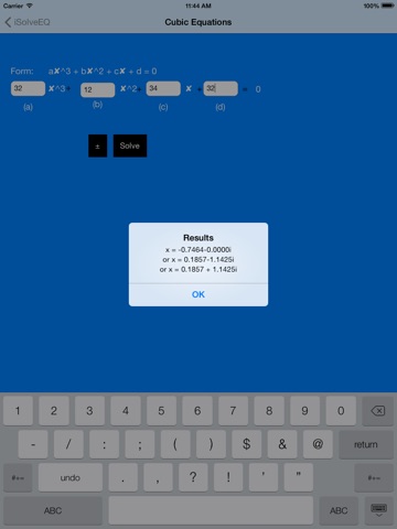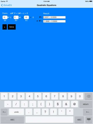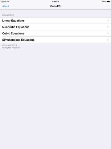 iSolveEQ is a very handy and easy to use equation solver. iSolveEQ can solve many types of equations including cubic and 3 simultaneous equations. iSolveEQ is and always will be free. iSolveEQ is sophisticated enough to give you the results in complex form. Quit wasting your precious time in and do your work quicker and more efficiently by solving equations at the blink of an eye.
