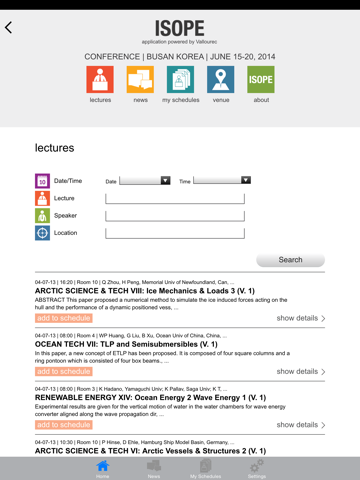 This app will prove useful when visiting the annual ISOPE Conference. It tells you about lectures, presentations, speakers, and other events. You can access abstracts and compile your own agenda for attending presentations, etc. You will also be updated on program modifications and special events.