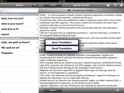 -Cut paste documents, articles, and emails into iSpeak to translate and have them read back