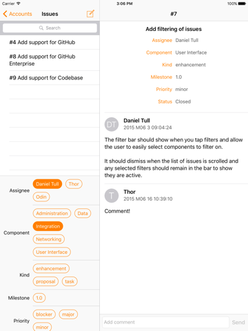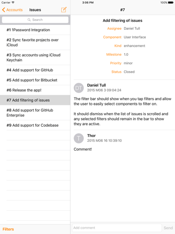 View and create tasks on your iPhone or iPad. With Issues, youll be using your bug tracker more efficiently, more often and in a beautiful way.