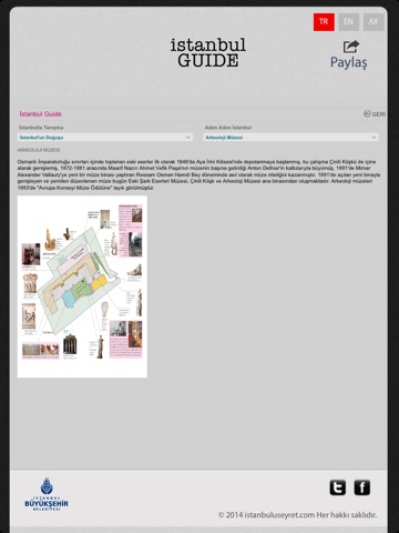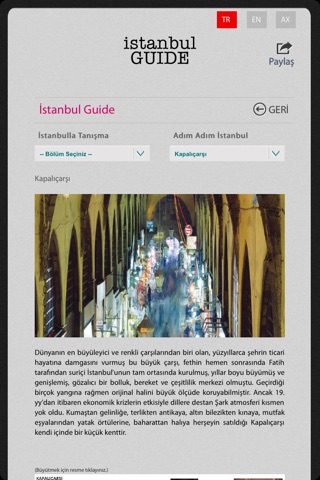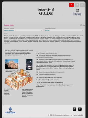 Bu uygulama, İstanbulun tarihi, turistik, kültürel mekanlarını daha yakından tanımanız amacıyla İstanbul Büyükşehir Belediyesi tarafından geliştirilmiştir. İstanbul Guide uygulaması ile İstanbulun en önemli mekanları hakkında bilgi sahibi olabilir ve İstanbulu keşif turunuzda kendinize rehber edinebilirsiniz.