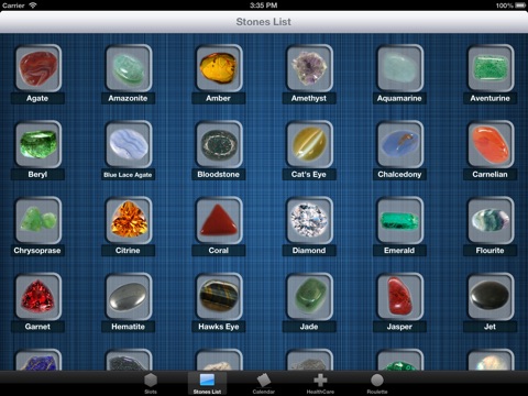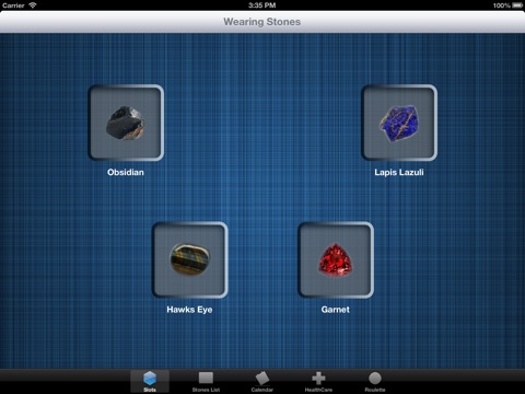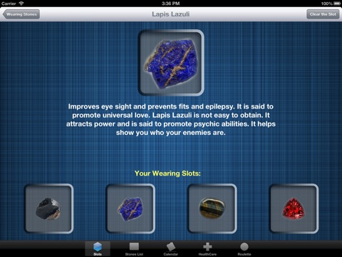 Also this App provides you with four virtual wearing slots. You can assign a stone to them, and virtually start wearing it, and (if you start to believe) you acquire all the abilities of current gemstone!