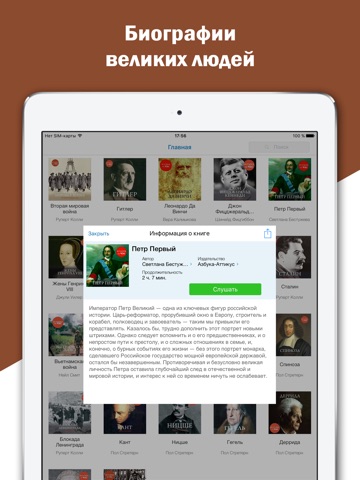 Приложение «История за час» расскажет о самых интересных исторических фактах и событиях в увлекательной и доступной форме. Слушая аудиокниги в приложении, вы не просто скоротаете время, но и узнаете много нового, расширите свой кругозор и повысите эрудированность!
