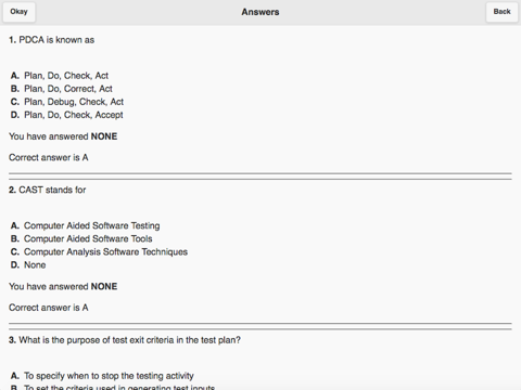 - Short exam section contains 10 questions for quickly testing your ISTQB Foundation Level skills, you have to complete this within 15 minutes, check the answers at the end.