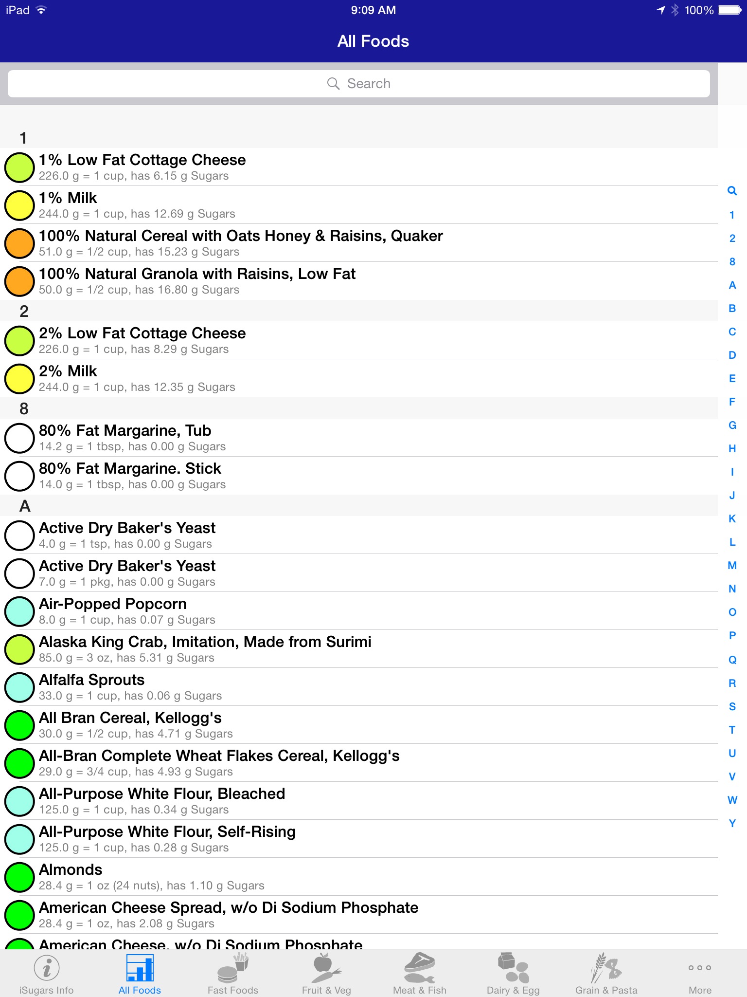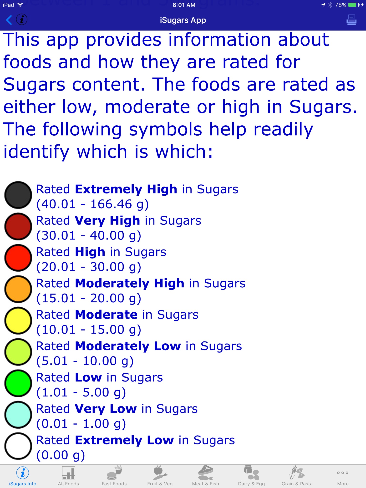 The iSugars app provides information about foods and how they are rated for content of sugars. This is provided as a means to assist in deciding which foods to eat. The food servings are rated from EXTREMELY LOW in sugars all the way up to EXTREMELY HIGH. The following colors help readily identify which is which: