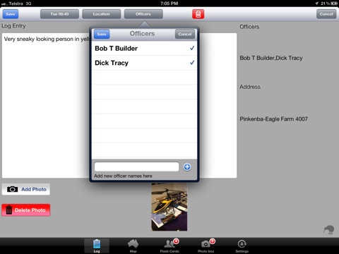 This app allow surveillance officers to track movements in realtime and share photos and log details. Log details can be entered on both iPad and iPhones.