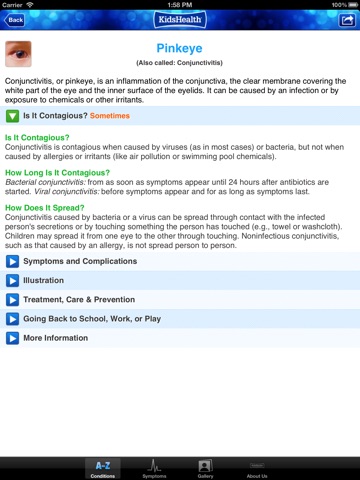 Instant, reliable information and images on 85+ infections and other conditions seen in childhood. This app, from the pediatricians of KidsHealth.org and the Nemours Alfred I. duPont Hospital for Children, gives parents the answers they need – starting with: "Is It Contagious?"