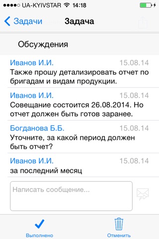 Приложение позволяет работать над задачами совместно, обсуждать, делегировать задания, уточнять позиции перед согласованием. Непосредственно в приложении можно добавлять, удалять, просматривать вложения (сканы документов, таблицы с расчетами, любые тексты, фото и т.п.).