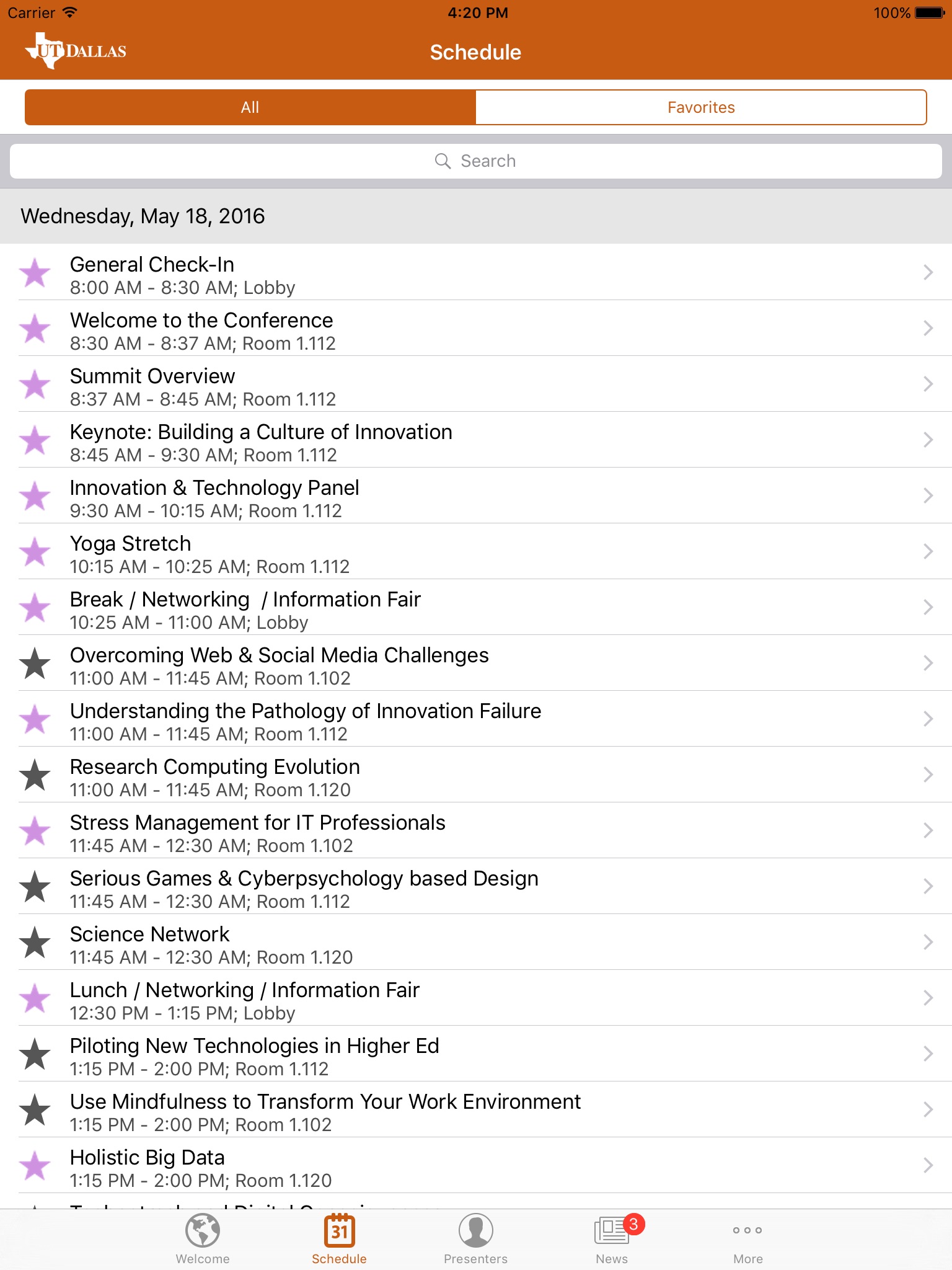 The University of Texas at Dallas Office of Information Technology will host our Innovation & Technology Summit. The purpose of the summit is to bring together the innovators and consumers of information technology with a focus on research, teaching, learning, and tech support at The University of Texas at Dallas to foster an environment of innovation.