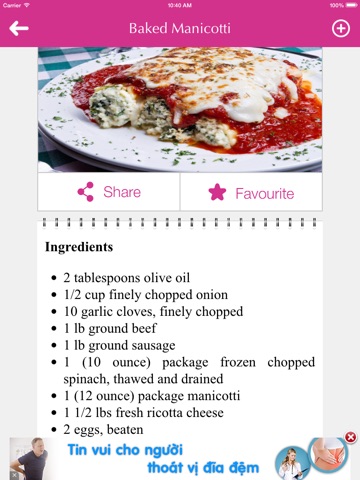 Are you interested in Italian Food? We provide you most exciting recipes across Italian countries in Italian Food Recipes app. This app gives you a variety of food items that makes cooking easy and fun. You can make your favorite Italian dishes easily at your home. Using this app you can experiment a lot of new food and even discover new recipes that suits your taste. There are a lot of categories to choose from, such as Appetizers, Desserts, Side dishes. You can try to cook sandwich, burgers, pizza, hot Italian pasta, tacos, ice creams, cakes and other sweet items. Whats more, you can share your favorite recipes with friends through Facebook, or email.