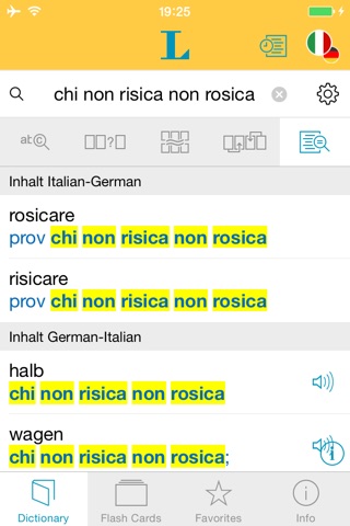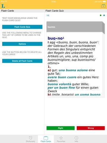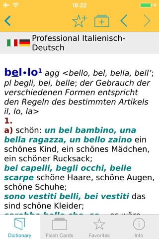 - sehr viele Wörter (ich kenne kein Wörterbuch und keine App, die mehr bietet) - sehr viele Vertonungen (20.000 deutsche und 50.000 italienische) - von Muttersprachlern gesprochen; mit wirklich angenehmen Stimmen - man kann bei den Übersetzungen auf einzelne Wörter klicken und bekommt dann direkt deren Wörterbucheintrag angezeigt ( selbst wenn diese nicht verlinkt aussehen) - sehr praktisch, verwende ich häufig - gut gemachtes integriertes Karteikarten Lernsystem; damit kann ich das neu gelernte immer weiter festigen :-) - man kann die Schriftgrößen einstellen und bekommt somit mehr auf den Bildschirm - die App ist sehr schnell und stürzte bisher nicht ab Fazit: Irgendein Verbesserungspotential gibt es immer, aber für mich fehlt hier nichts Wesentliches. Für meine Bedürfnisse ist diese App perfekt - auch weil ich sie im Ausland ohne Internetverbindung nutzen kann.