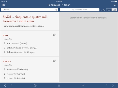 The verb conjugation tool has complete conjugations for thousands of verbs in all standard forms, and the number translator converts numerals into Portuguese or Italian text instantly!