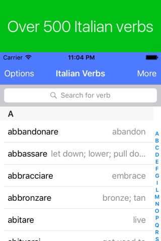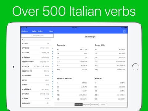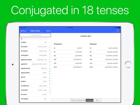 View over 500 Italian verbs in 18 tenses. With simple navigation and built in search, you can find the verb you need in seconds.