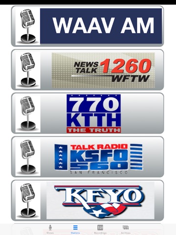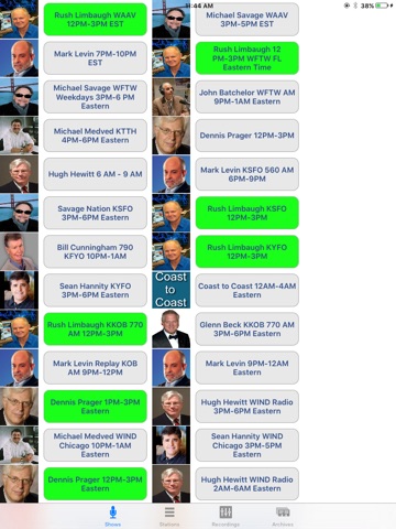 Listen to top talk radio shows live on your iPhone or iPad. Also includes ability to record and play back recordings of your favorite Rush, Hannity or Mark Levin shows and listen by Station. Includes live access to these top talk radio shows: