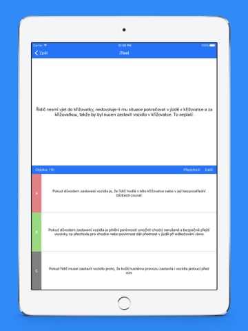 Kromě samotného testu, který je sestaven přesně podle kriterií oficiální zkoušky, si můžete otázky procházet podle kategorií, prohlížet chybné odpovědi nebo sledovat svůj postup v jednoduchých statistikách.