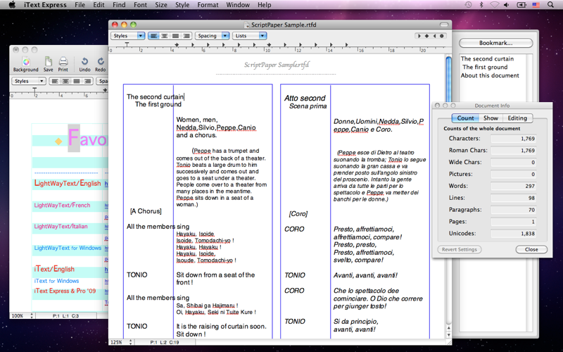 iText Express fully includes the TextEdit basics and has Microsoft(R) Word compatibility too, as it runs under the architecture of Mac OS X NSTextView. It allows you to read and write various documents including RTF, RTFD, TEXT/DOC/HTML, Unicode, plain text, and LightWayText/iText format files. iText Express also allows you to read .epub public domain eBooks. Perfect for any language, and with a spell checker.