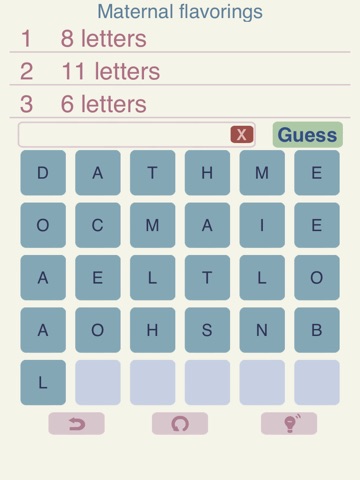 In each puzzle of this game, you are given one clue, your task is to guess all the correct words for each clue. All the letters of the 3 words are randomly displayed to players.