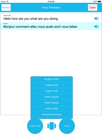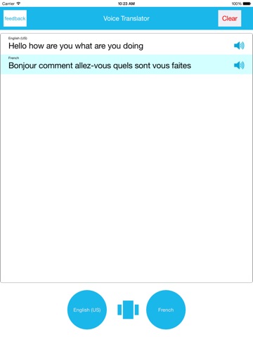 Please select any button and speak to the app, the app will recognize the speech and will translate to the desired language. Once translated the speech, you can freely share it on any social network such as twitter and facebook and can send through SMS and Email without any limit and restriction.