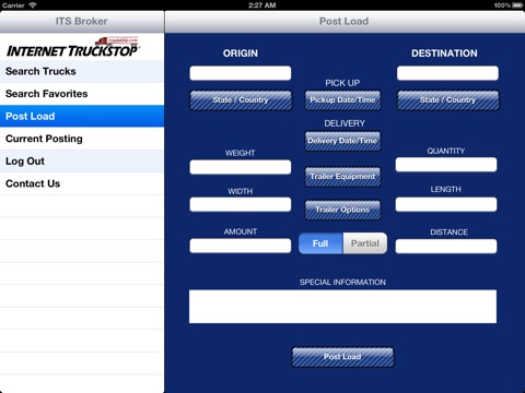 Internet Truckstop’s ITS Broker allows you to use your iPhone/iPad to access the largest load board in the industry to Search for available Trucks and Post your Freight