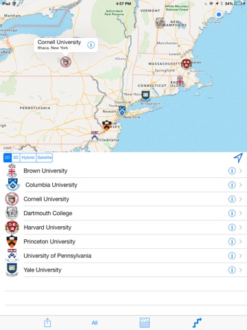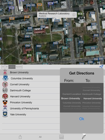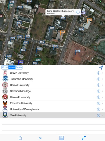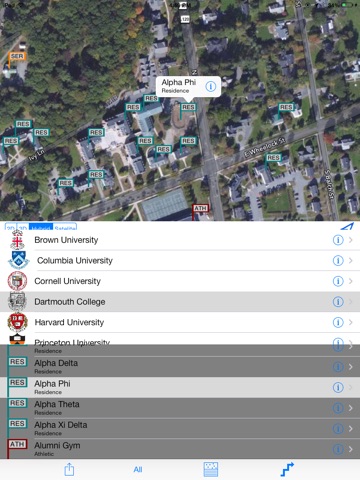 The Ivy League Navigator has each campus mapped out . . . follow the pulsing blue dot as you walk from building to building. Tap on the admissions office flag; the chem building; the soccer field and the app will show you how to get there. Another tap launches applicable web page. Ready to head to the next campus? Simply set the dials and the app displays a map and driving directions to the next admissions office.