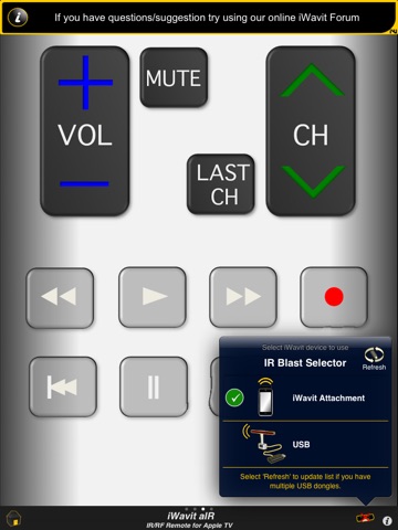 It should be noted that there is another iWavit app called iWavit Apmote which controls Apple devices by communicating directly via RF signals to the iWavit USB dongle plugged into the Apple device, and makes no use of the IR signals. See the App Store for more details.