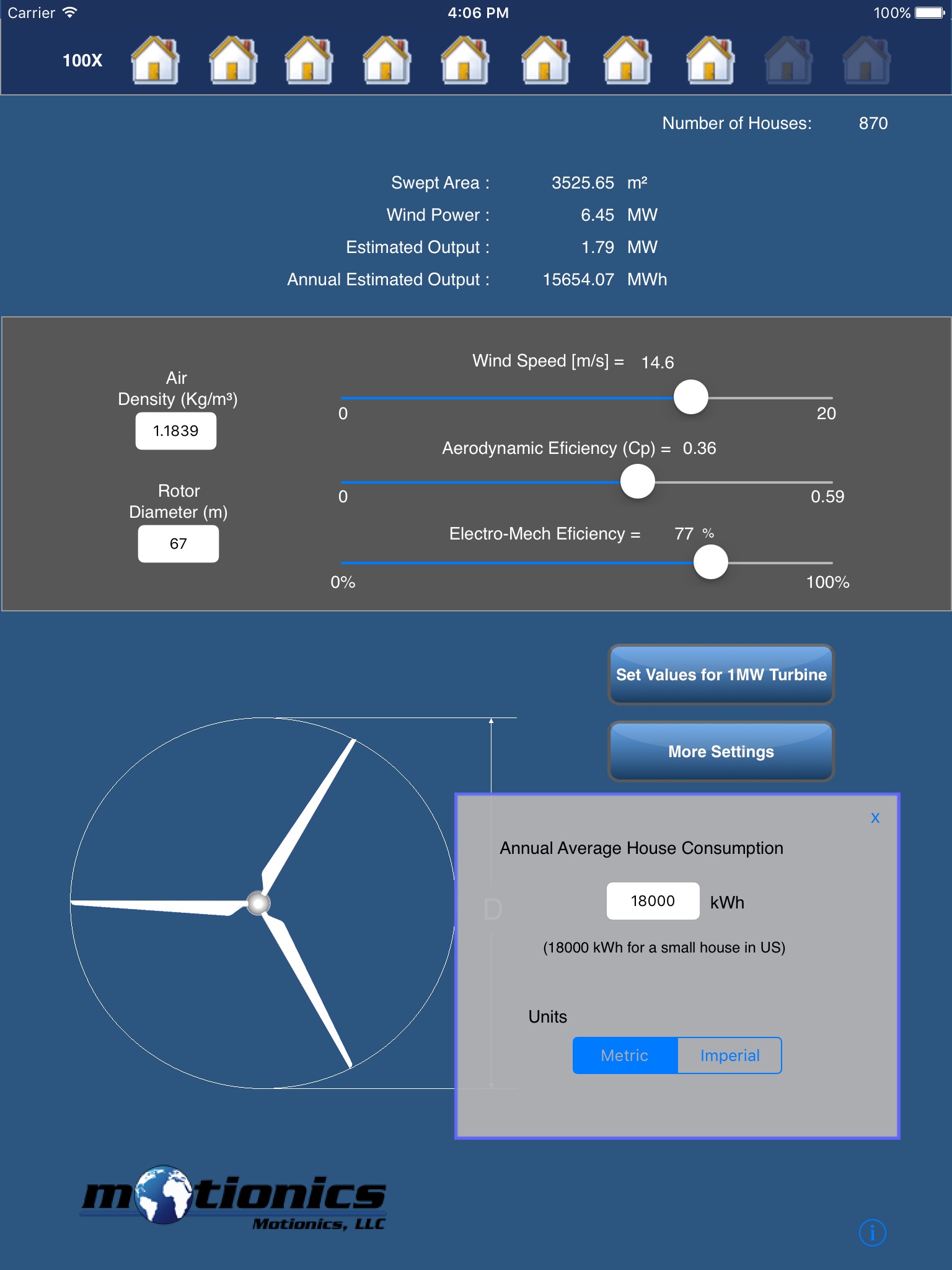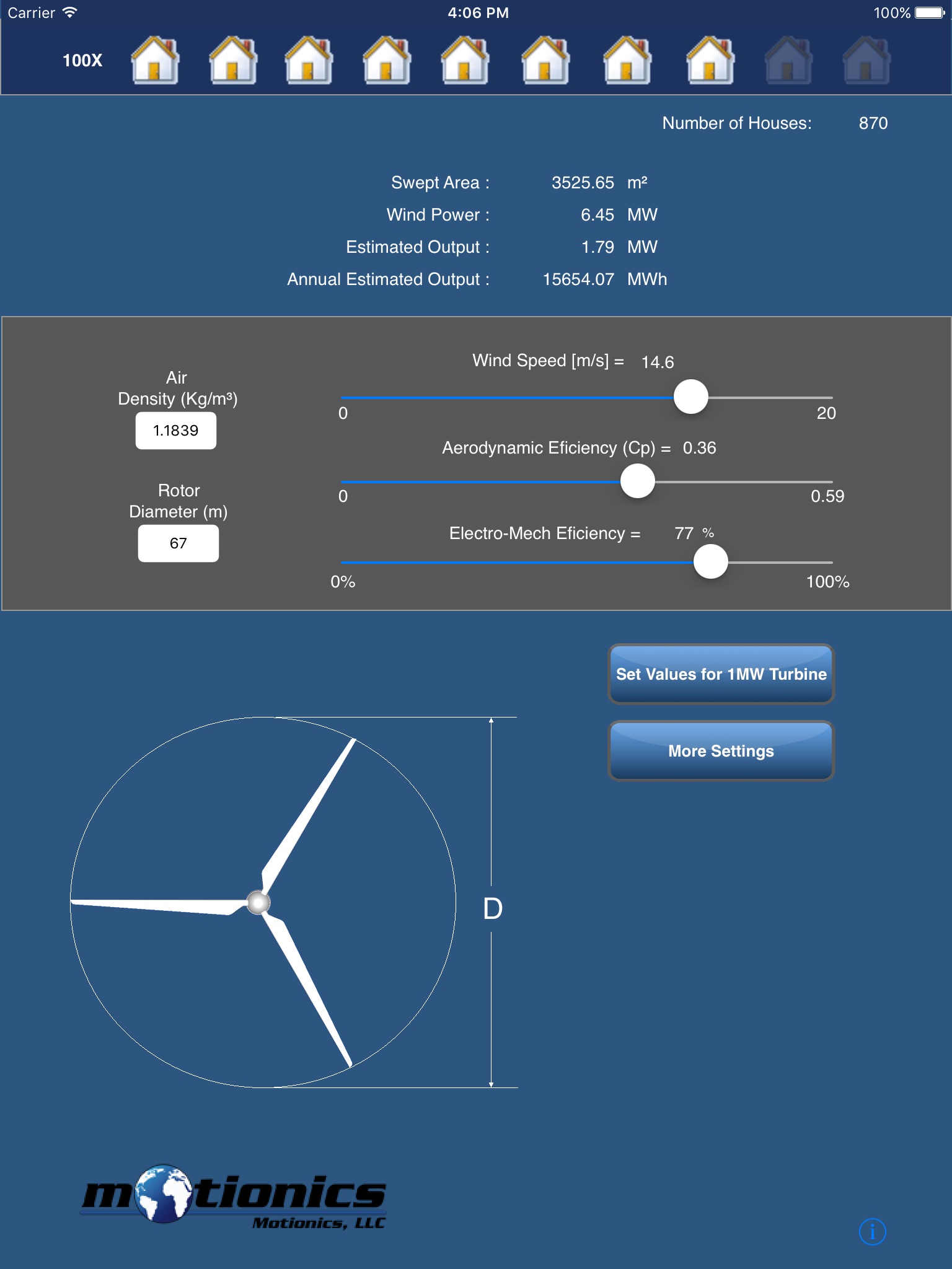 iWindTurbine calculates the electricity power generated by horizontal axis wind turbines. Enter the rotor diameter, air density, wind speed, aerodynamic efficiency and electro-mechanical efficiency of the turbine and iWindTurbine calculates the generating electricity power and the number of houses that can be powered with this turbine.