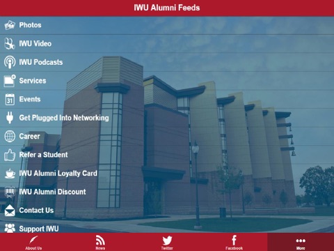 About Us, News, Twitter, Facebook, Photos, IWU Video, IWU Podcasts, Services, Events, Get Plugged Into Networking, Career, Refer a Student, IWU Alumni Loyalty Card, IWU Alumni Discount, Contact Us, Support IWU, Alumni