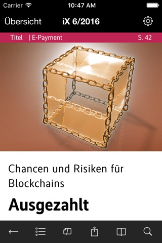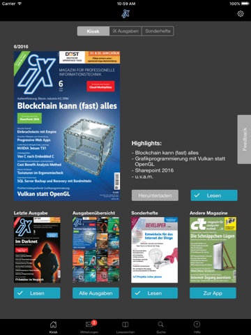 Monatlich präsentiert Ihnen die Redaktion Tipps, Berichte und Reportagen, die der Technik auf den Grund gehen: gründlich recherchiert, kritisch analysiert und unabhängig geschrieben. Die iX-Sonderpublikationen sind ebenfalls in der App verfügbar.